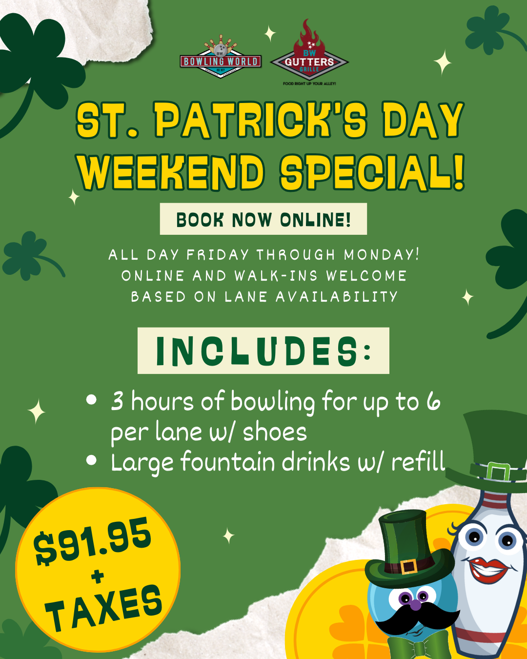 $91.95 (+tax) Includes: • 3 hours of bowling for up to 6 people per lane • Large fountain drinks w/ refill
