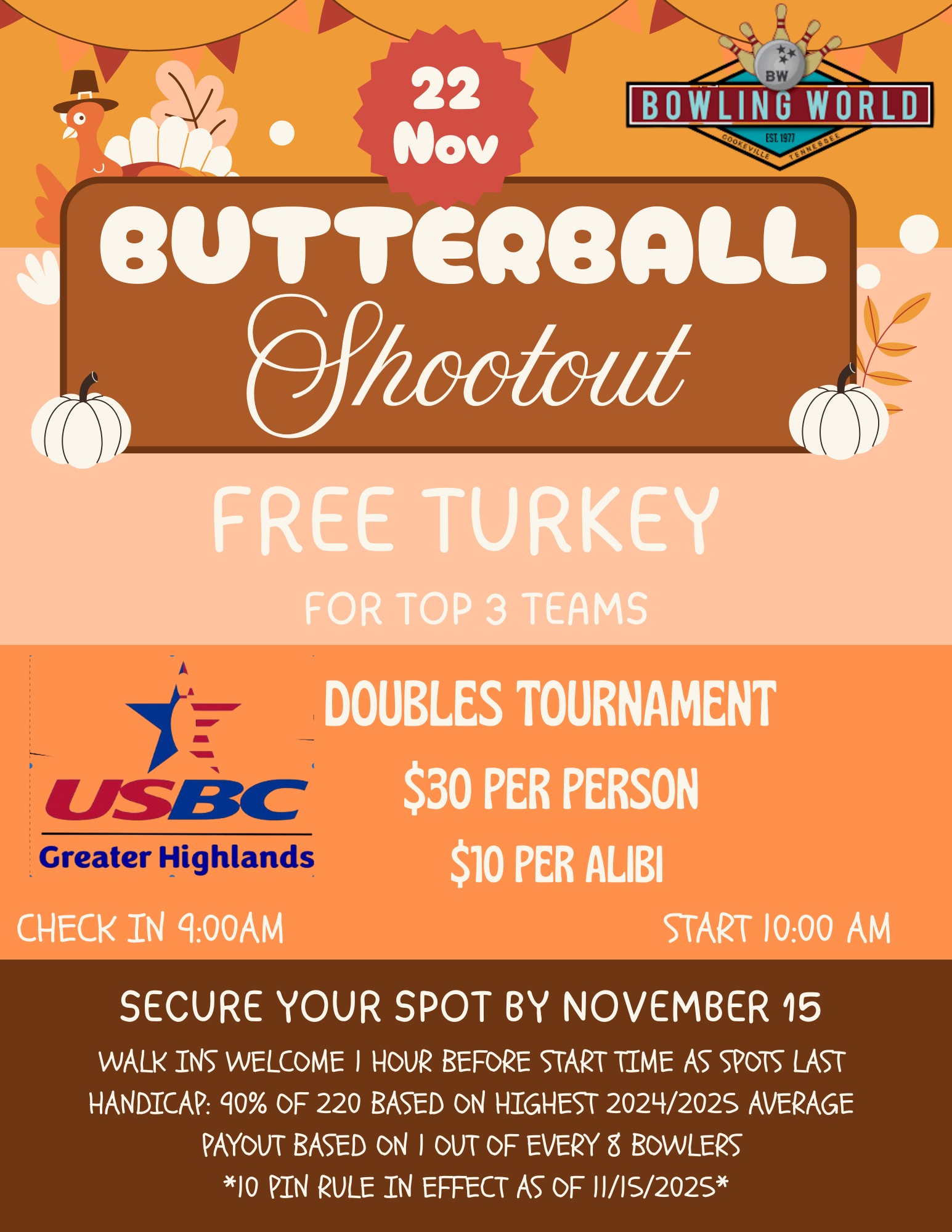 Free Turkey for Top 3 Teams Doubles Tournament$30 per person$10 per alibi Check-in: 9:00 AMStart Time: 10:00 AM Secure your spot by November 15Walk-ins welcome 1 hour before start time...