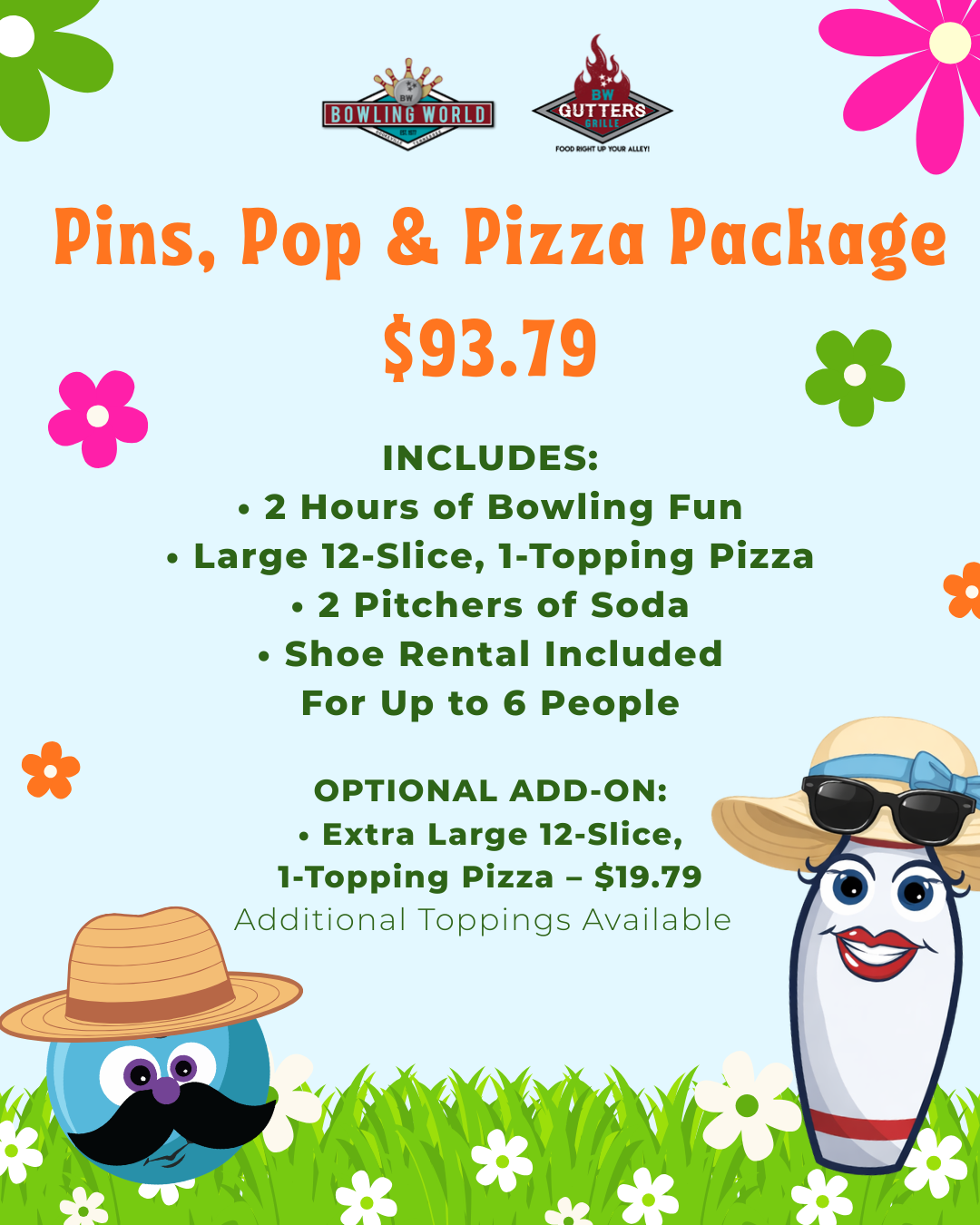 Pins, Pop & Pizza Package – $93.79• 2 hours of bowling for up to 6 people• Shoe rental included• Large 12-slice, 1-topping pizza• 2 pitchers of soda to share Need...