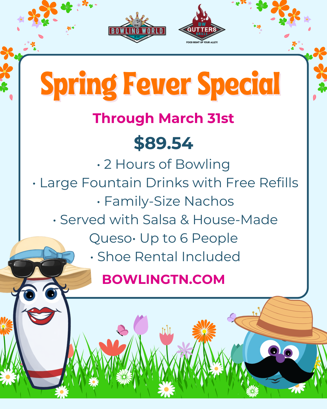Spring Fever Special – $89.54• 2 hours of bowling for up to 6 people• Shoe rental included• Large fountain drinks with free refills• Family-size platter of crunchy nachos with salsa and creamy queso